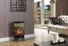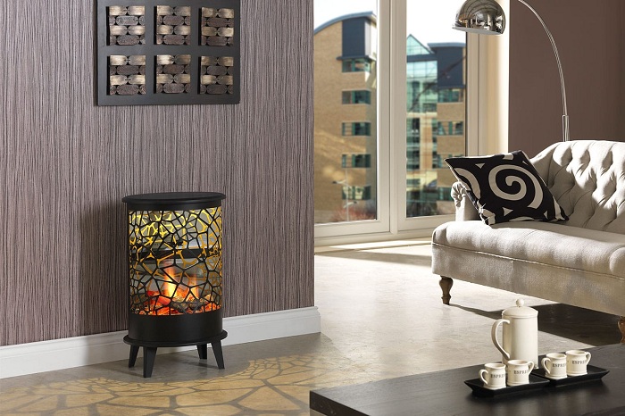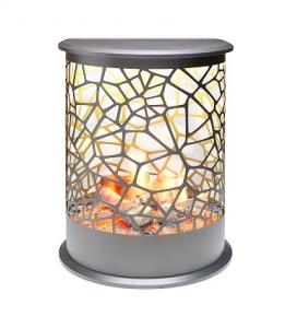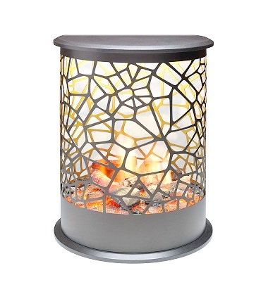 В круглом камине задняя стенка представляет собой LED-поверхность, на которую проецируется реалистичное изображение ярко пылающего очага с разлетающимися искрами. В камине предусмотрен и звуковой эффект потрескивающих поленьев. Данная серия очагов не требует топлива, камин работает от электросети.
