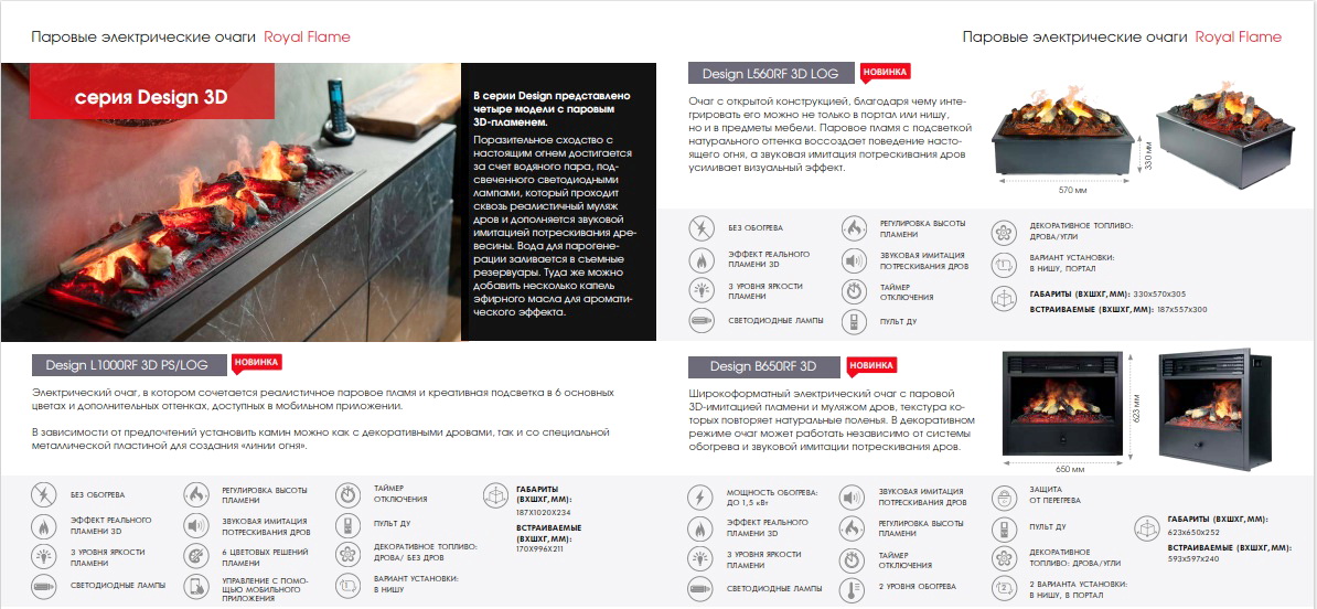 В серии Design представлено четыре модели с паровым 3D-пламенем. Поразительное сходство с настоящим огнем достигается за счет водяного пара, подсвеченного светодиодными лампами, который проходит сквозь реалистичный муляж дров и дополняется звуковой имитацией потрескивания древесины. Вода для парогенерации заливается в съемные резервуары. Туда же можно добавить несколько капель эфирного масла для ароматического эффекта.