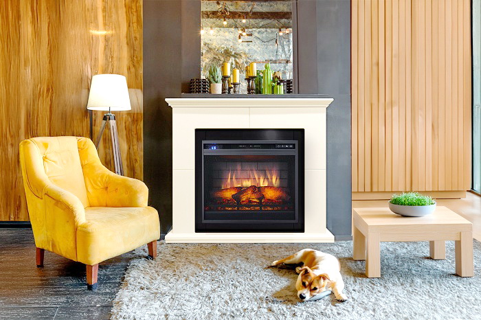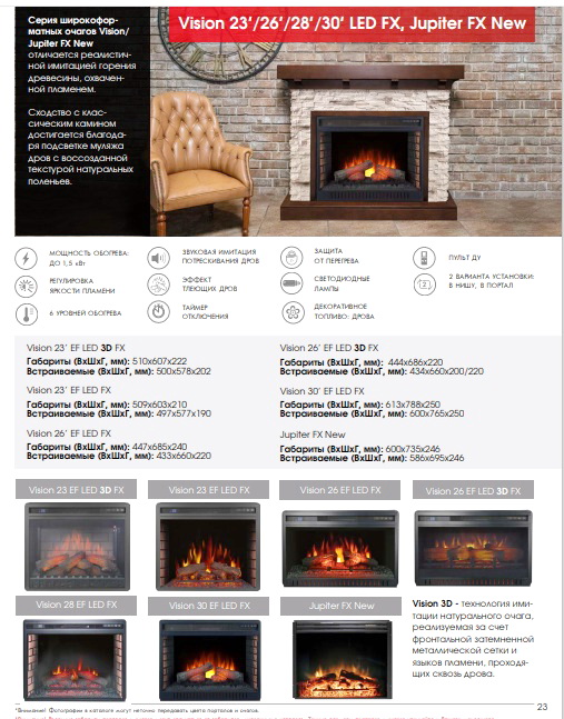 Электрический очаг Vision 23 EF LED 3D FX можно встраивать в нишу в стене или устанавливать в портал. При этом лучше всего он будет смотреться в помещениях небольшого размера.