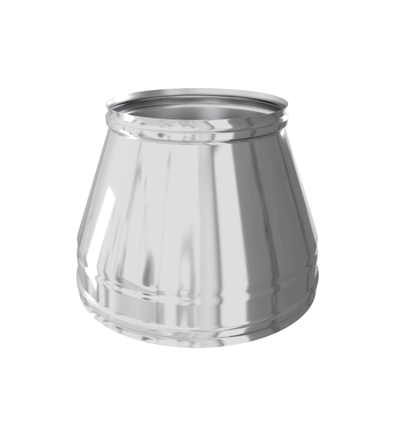 Завершающий элемент дымового канала, закрывает торцы сэндвича и предохраняет теплоизоляцию от атмосферных осадков. Внутренний контур изготовлен из коррозионностойкой нержавеющей стали AISI 316L толщиной 0,5 мм. Внешний контур выполнен из аустенитной стали AISI 304 толщиной 0,5 мм. Холодная формовка раструбного соединения с идеальной геометрией и газоплотностью. Лазерная сварка встык обеспечивает тонкий и прочный шов, увеличивая в разы срок эксплуатации. Рабочая температура до 450°С.