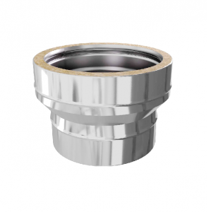 Элемент дымоходного канала для перехода с одностенных элементов на двустенные утепленные. Внутренний контур изготовлен из коррозионностойкой нержавеющей стали AISI 316L толщиной 0,5 мм. Внешний контур выполнен из аустенитной стали AISI 304 толщиной 0,5 мм. Теплоизоляция в верхней части элемента выполнена из базальтовой ваты. Холодная формовка раструбного соединения с идеальной геометрией и газоплотностью. Лазерная сварка встык обеспечивает тонкий и прочный шов, увеличивая в разы срок эксплуатации. Рабочая температура до 450°С.