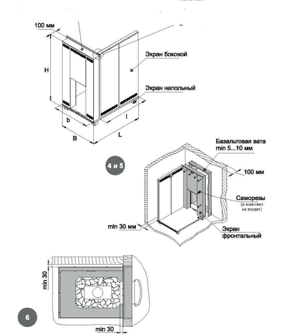 Защитные экраны предназначены для использования с банными печами с температурой наружных стенок (конвекторов) не более 400˚С, а так же для защиты от возгорания конструкций парильного помещения бани из горючих материалов. Применение защитных экранов позволяет обойтись без использования кирпичной кладки при установке печи.