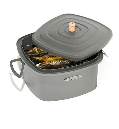 В этой модели отсутствует встроенная дровяная печь, коптильня представляет собой камеру высотой 25 см и диагональ в плане 39 см. Удобна для транспортировки, не занимает много места при хранении.