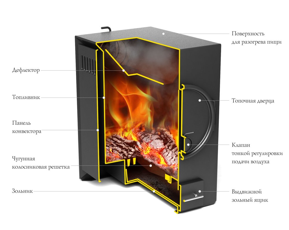 Боковые панели снимают конвекционное тепло со стенок печи и экранируют исходящее от них инфракрасное излучение. Верхняя горизонтальная поверхность вмещает сразу несколько единиц посуды. Сменный чугунный колосник обеспечивает равномерное горение. Печь отличается оригинальным дизайном, поскольку она изготовлена без единого видимого сварного шва.