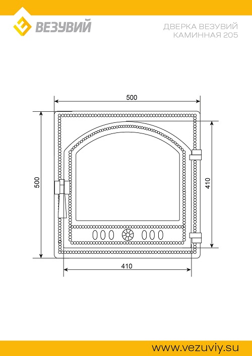 Двери изготовлены из качественного чугуна по ГОСТ 1412-85, производятся в комплектациях с глухим полотном или стеклом. Ручки дверей также сделаны из чугуна.