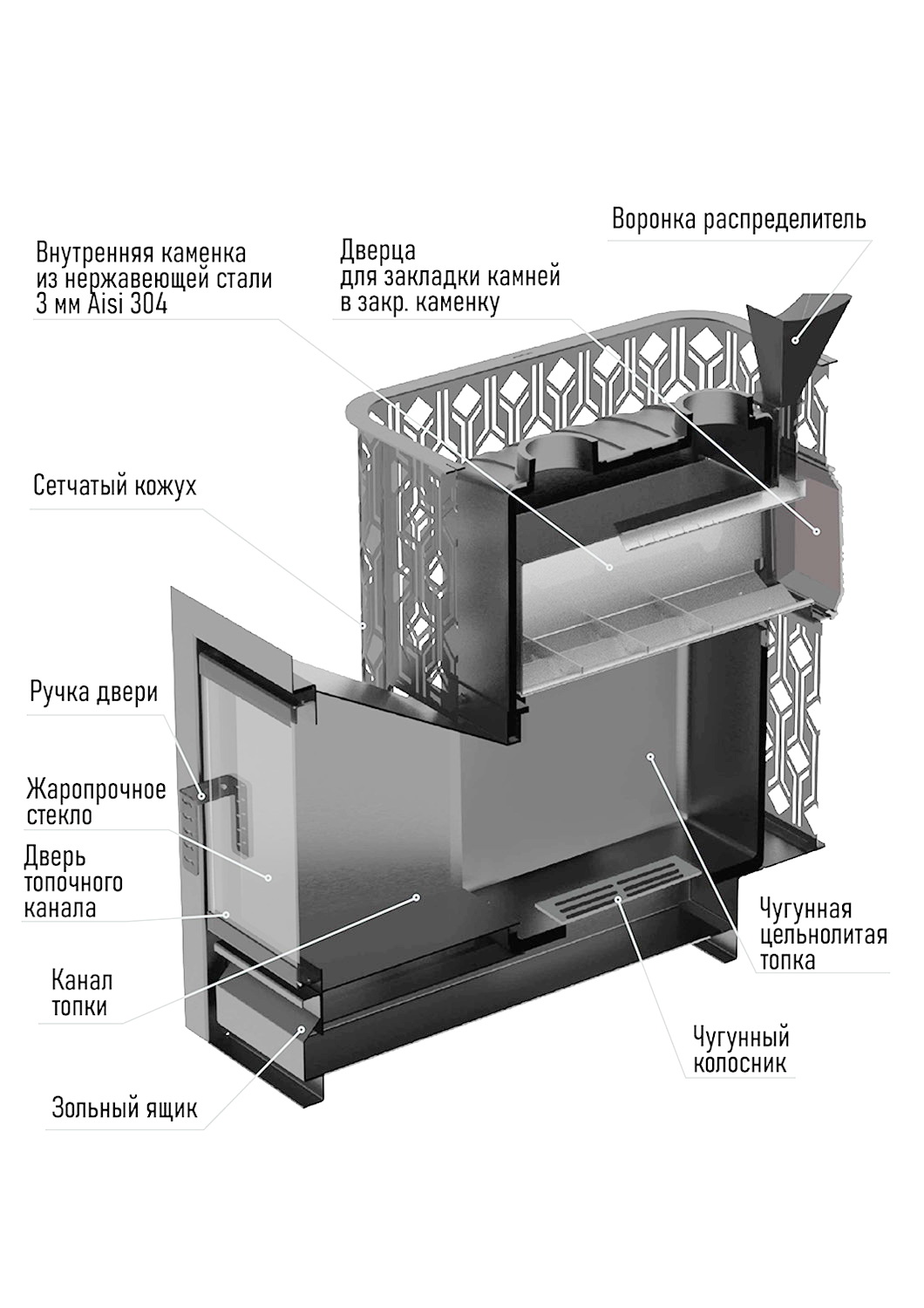 Топка печи, газоходные каналы и приёмная плита открытой каменки выполнены из высококачественного чугуна толщиной до 25 мм, марки СЧ-20. Закрытая каменка выполнена из жаропрочной 4 мм нержавеющей стали!