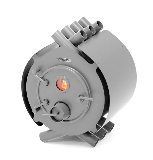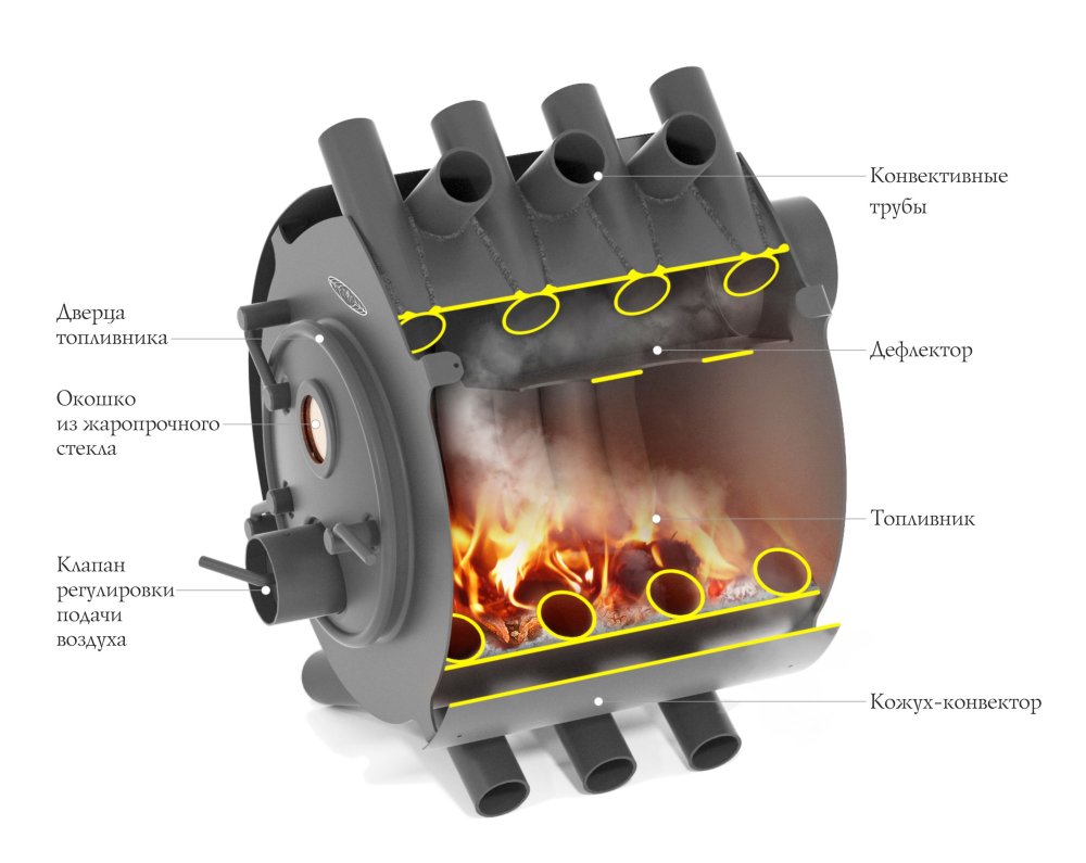 Печь состоит из набора одинаковых конвекционных труб, окружающих топочную камеру. Холодный воздух, проходя по горячим трубам, нагретые излучением от горящего топлива, создает естественную конвекцию, благодаря чему происходит быстрый нагрев воздуха и его плавное распределение по всему объему помещения.