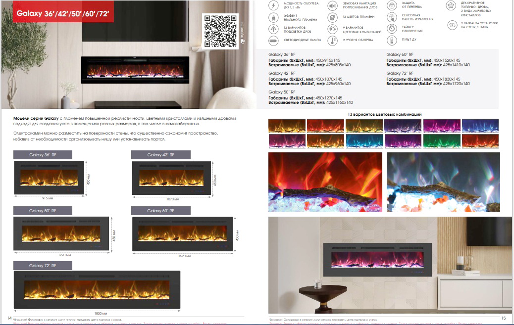 Модельный ряд серии каминов Galaxy представлен 5 типоразмерами – диагональю 36, 42, 50, 60, 72 дюйма.