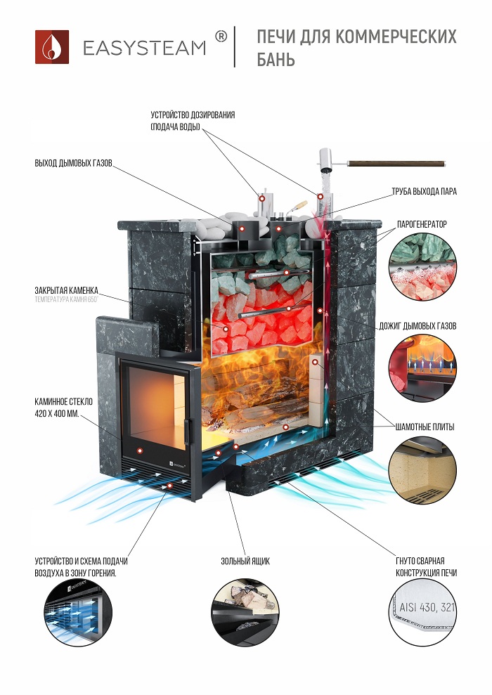 Печь оснащена съёмной закрытой каменкой, позволяющей разогревать находящиеся в ней камни до температуры 600 градусов.