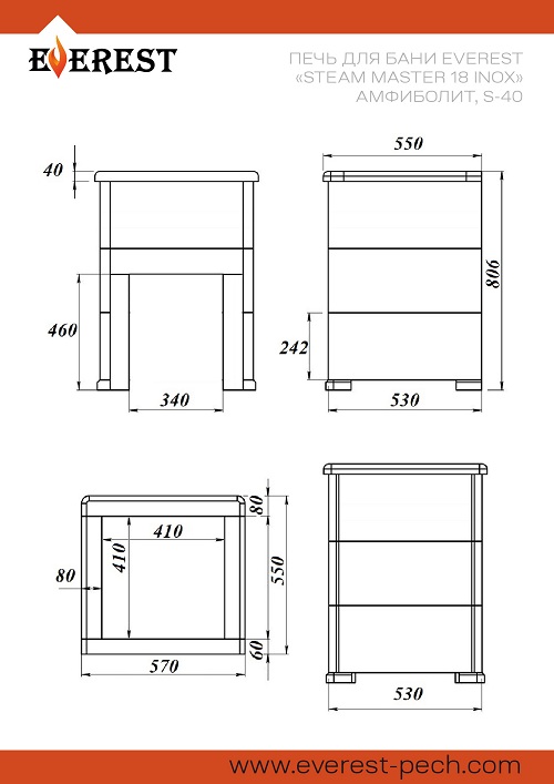 Печь для бани Эверест "Steam Master 18 INOX" Амфиболит, S-40 изготовлена из нержавеющей стали. Печь предназначена для установки в частные и коммерческие бани с объёмами парных помещений до 18 м³.