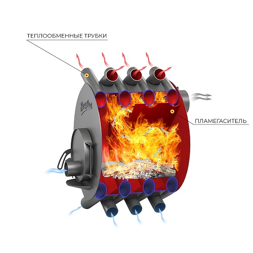 Две камеры сгорания, нижняя камера газификации и верхняя камера дожига газов, обеспечивают практически полное сгорание топлива и получение максимального количества энергии во время работы печи.