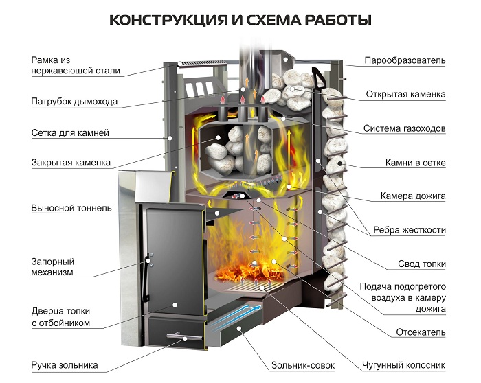 Особенная трехпоточная система газоходов, с распределительной камерой под каменкой, значительно повышает интенсивность прогрева камней и помещения. В конструкции печи также предусмотрен дополнительный канал подачи подогретого воздуха в зону дожига уходящих газов под каменкой, благодаря которому камни в закрытой и открытой каменке прогреваются до максимально высоких температур, что улучшает качество пара и существенно увеличивает КПД печи.