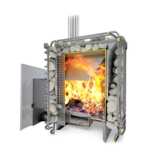 Конструкция печи-каменки представляет собой топку, выполненную из высоколегированной нержавеющей стали с содержанием хрома не менее 13 %, вокруг которой помещается большой объём камней, заключённый в конвектор-сетку. Детали топки, несущие наибольшую термическую, коррозионную и механическую нагрузку, изготавливаются из нержавеющей стали c содержанием хрома не менее 17%, что обеспечивает увеличенный ресурс эксплуатации в кислородсодержащих средах при высоких температурах. Толщина металла в печах модификации ПРОФИ — 4мм, в остальных — 2мм. Печь имеет выносной топливный канал позволяющий протапливаться из смежного помещения. В исполнении печей Панорама дверь топливного канала выпускается со светопрозрачным экраном с жаростойким стеклом SCHOTT ROBAX большого размера, который позволяет визуально контролировать горение.