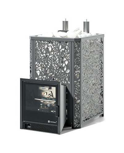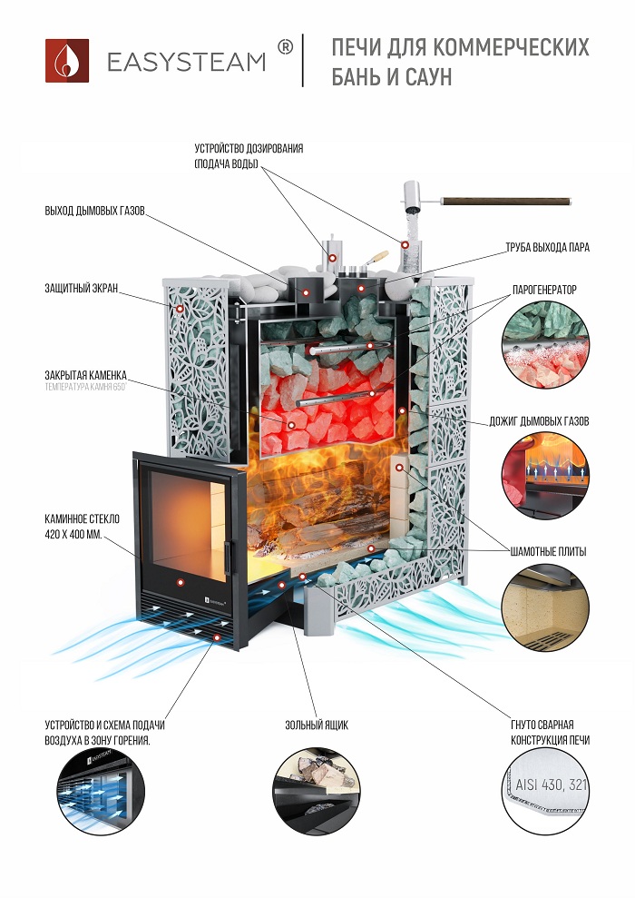 Особо прочная газо-дровяная печь постоянного действия, предназначенная для создания в парильном отделении общественной или коммерческой бани, условий русской бани и сауны, с присущим ей температурно-влажностным режимом. Резной кожух-сетка с открытой каменкой под закладку камней или с ламелями из природного камня позволяет сохранять выделяемое печью тепло и улавливать инфракрасное излучение. Ламели для кожуха могут быть изготовлен из четырёх видов природного камня: