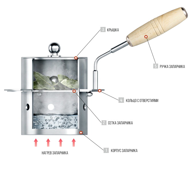 Запарник предназначен для придания целебных свойств и аромата воздуху в парильном отделении. Корпус запарника представляет собой цилиндр, на дно которого наливается вода. В средней части устанавливается сетка для закладки смеси сухих трав и листьев. Сверху запарник закрывается крышкой. Сбоку запарника расположено кольцо с отверстиями для установки на отверстие выхода пара печи. Отверстия необходимы для свободного выхода пара из каменки печи. Запарник устанавливается на печь с помощью ручки.