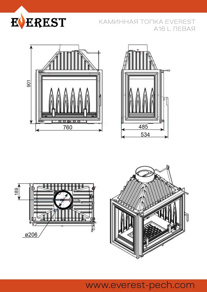 Каминная топка EVEREST A16L имеет с левой стороны дополнительное остекление. Топка изготовлена из качественного жаростойкого чугуна (ГОСТ 1412-85) с толщиной стенок 6-10 мм. Вес топки составляет 186 кг. Модель рассчитана на обогрев помещений объёмом до 320 м³. Каминная топка имеет высокую аккумуляционную камеру (дымосборник) и часто расположенные радиаторы на корпусе топки, которые обеспечивают высокий КПД и увеличивают мощность до 16 кВт. В аккумуляционной камере (дымосборнике) установлен чугунный пламегаситель. Патрубок дымохода с внутренним диаметром 203 мм, оснащён поворотным шибером. Заслонка изготовлена из чугуна, а её положение регулируется ручкой на передней панели топки.