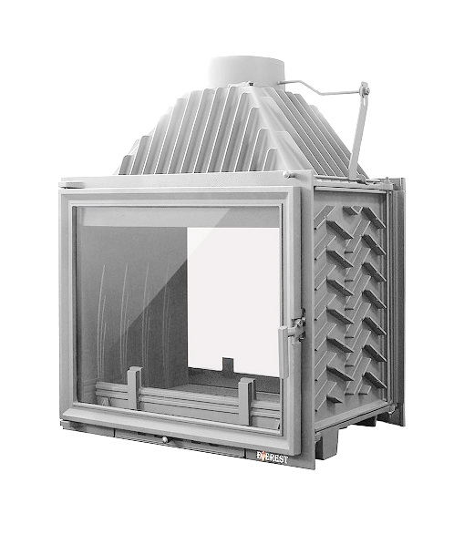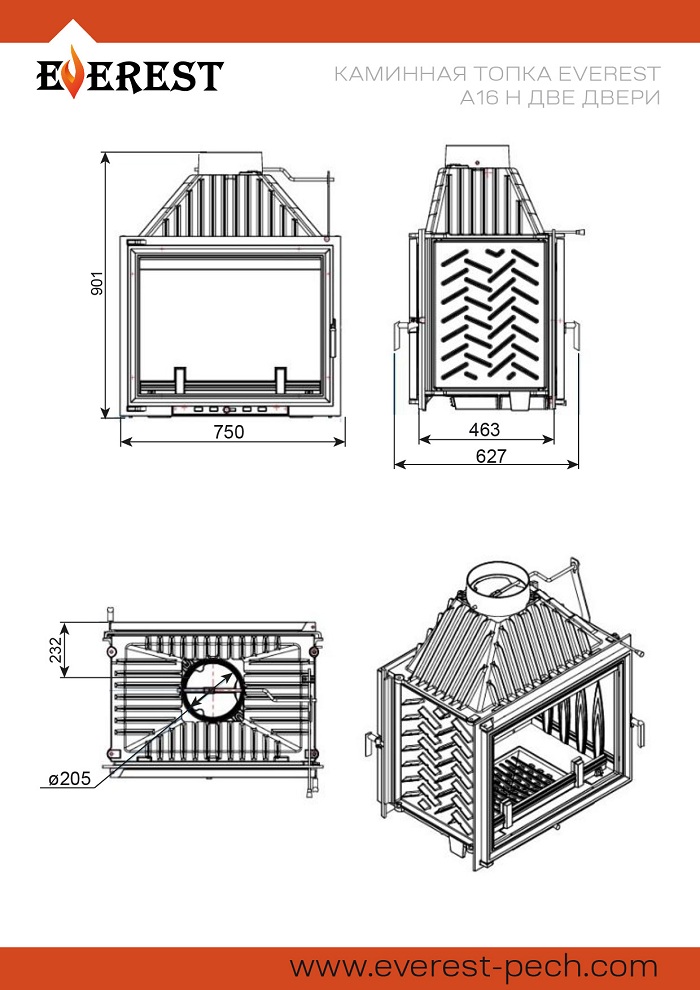 Каминная топка EVEREST A16H имеет топочную дверь установленную как с передней, так и с задней части. Топка изготовлена из качественного жаростойкого чугуна (ГОСТ 1412-85) с толщиной стенок 6-10 мм. Вес топки составляет 195 кг. Модель рассчитана на обогрев помещений объёмом до 320 м³. Каминная топка имеет высокую аккумуляционную камеру (дымосборник) и часто расположенные радиаторы на корпусе топки, которые обеспечивают высокий КПД и увеличивают мощность до 16 кВт. В аккумуляционной камере (дымосборнике) установлен чугунный пламегаситель. Патрубок дымохода с внутренним диаметром 203 мм, оснащён поворотным шибером. Заслонка изготовлена из чугуна, а её положение регулируется ручкой на передней панели топки.