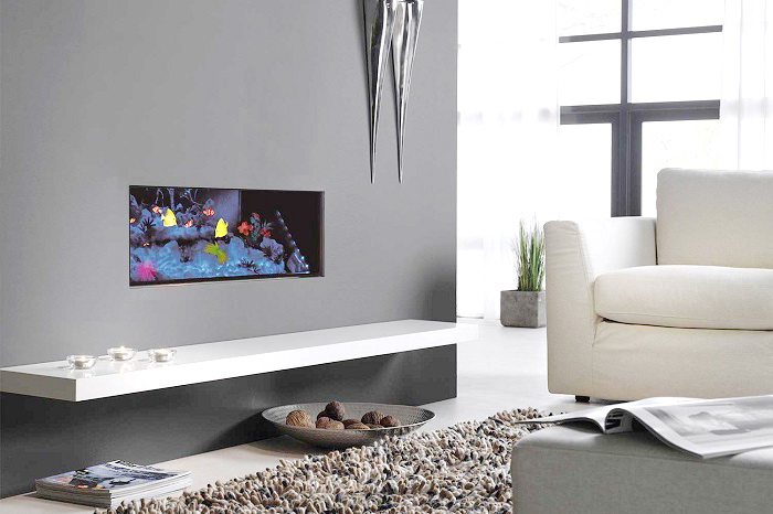 Серия Opti-V – это уникальная линейка электрических каминов, в которых интегрирован LED-экран. В модели Aqua-V, аналогов которой нет на российском рынке, на проекции изображен подводный мир океана с плавающими экзотическими рыбами. Это идеальный аквариум, который не требует чистки, смены воды, кормления рыб.