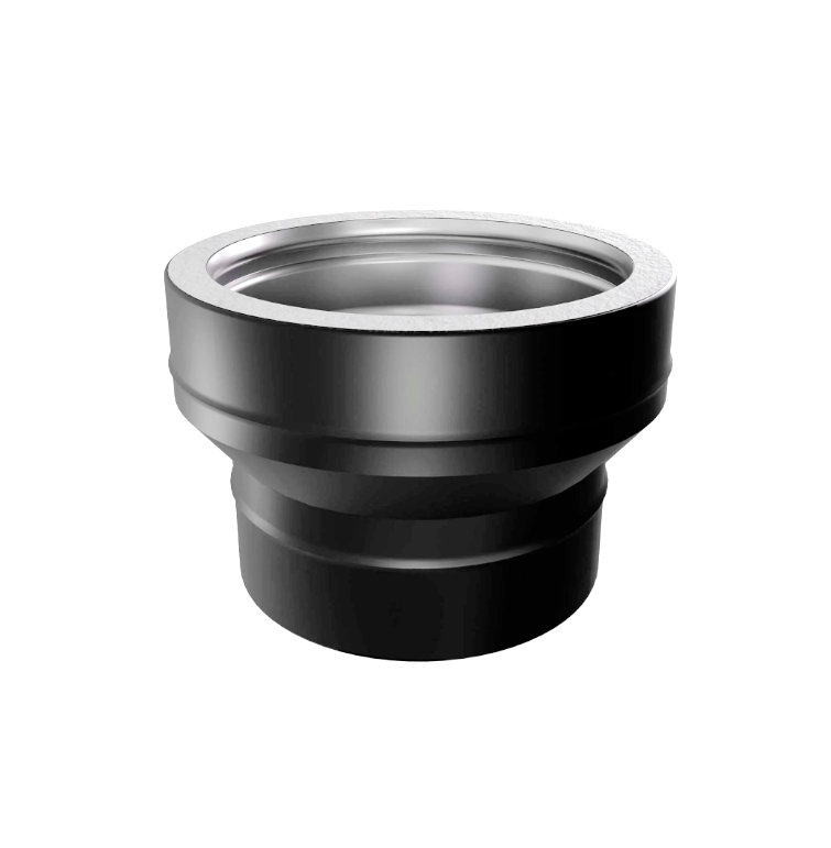 Элемент дымоходного канала для перехода с одностенных элементов на двустенные утепленные. Внутренний контур изготовлен из коррозионностойкой нержавеющей стали AISI 316L толщиной 0,8 мм. Внешний контур выполнен из стали AISI 430 толщиной 0,5 мм, окрашен матовой черной термостойкой эмалью, что исключает появление следов побежалости. Теплоизоляция выполнена из керамического волокна, это позволяет свести к минимуму образование конденсата и будет способствовать быстрому прогреву дымоходного канала и выходу системы в рабочий режим. Холодная формовка раструбного соединения с идеальной геометрией и газоплотностью. Лазерная сварка встык обеспечивает тонкий и прочный шов, увеличивая в разы срок эксплуатации. Рабочая температура до 600°С.