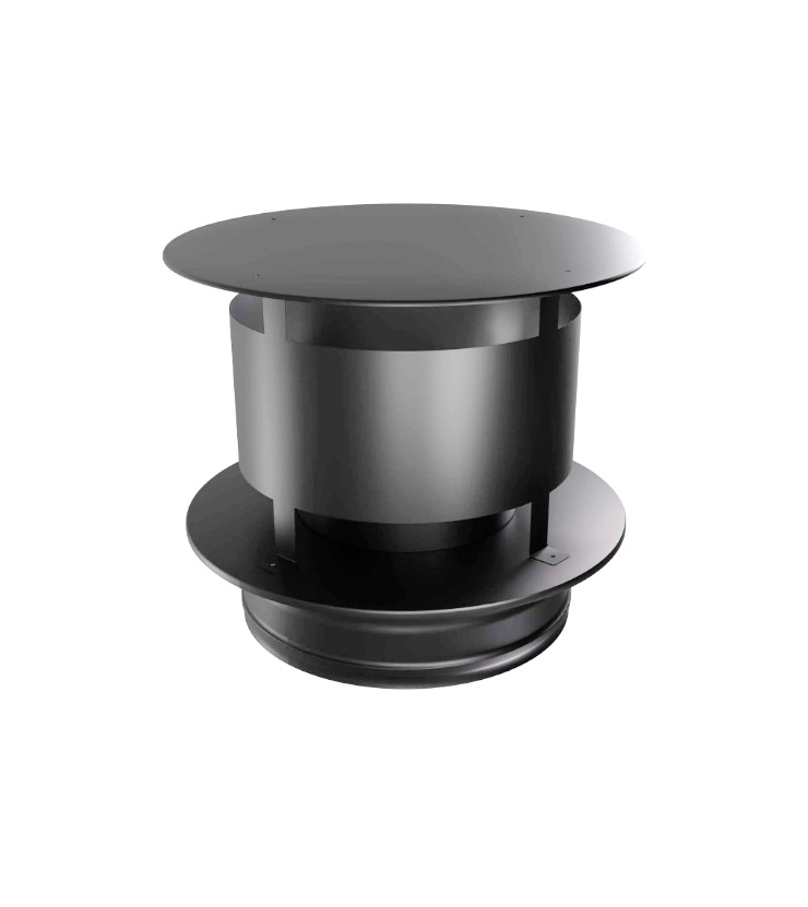 Завершающий элемент дымового канала, закрывает торцы сэндвича и предохраняет теплоизоляцию от атмосферных осадков. Защищает от порывов ветра и препятствует возникновению обратной тяги. Внутренний контур изготовлен из коррозионностойкой нержавеющей стали AISI 316L толщиной 0,8 мм. Внешний контур выполнен из стали AISI 430 толщиной 0,5 мм, окрашен матовой черной термостойкой эмалью, что исключает появление следов побежалости. Холодная формовка раструбного соединения с идеальной геометрией и газоплотностью. Лазерная сварка встык обеспечивает тонкий и прочный шов, увеличивая в разы срок эксплуатации. Рабочая температура до 600°С.
