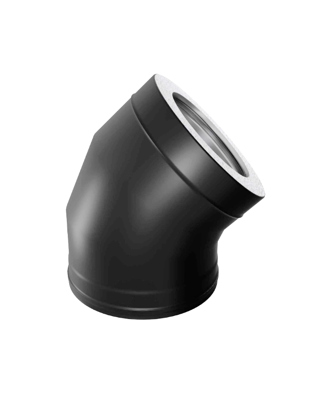 Элемент предназначен для изменения направления дымового канала и обхода препятствий во время монтажа. Внутренний контур изготовлен из коррозионностойкой нержавеющей стали AISI 316L толщиной 0,8 мм. Внешний контур выполнен из стали AISI 430 толщиной 0,5 мм, окрашен матовой черной термостойкой эмалью, что исключает появление следов побежалости. Теплоизоляция выполнена из керамического волокна, это позволяет свести к минимуму образование конденсата и будет способствовать быстрому прогреву дымоходного канала и выходу системы в рабочий режим. Холодная формовка раструбного соединения с идеальной геометрией и газоплотностью. Лазерная сварка встык обеспечивает тонкий и прочный шов, увеличивая в разы срок эксплуатации. Рабочая температура до 600°С.