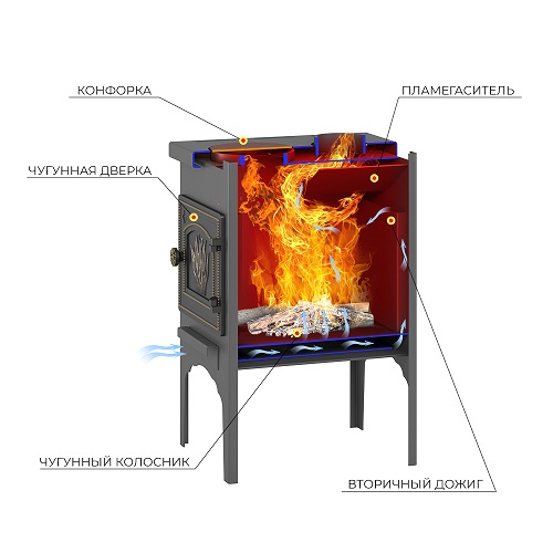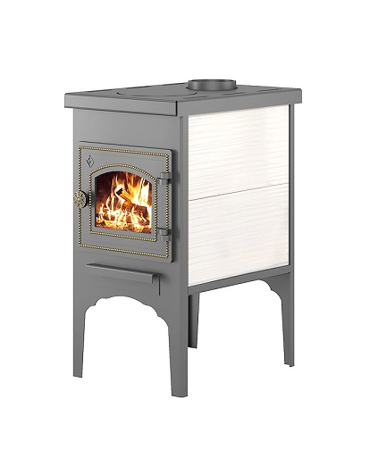 Верхнюю горизонтальную поверхность можно использовать для приготовления пищи. Печь укомплектована чугунным колосником и чугунной негерметичной дверцей Везувий ДТ-3. Печь облицована керамической плиткой для лучшего распределения тепла.