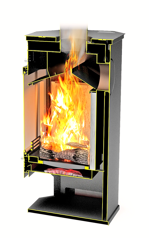 Топка камина «РУМБА» изготавливается из конструкционной стали толщиной 3 мм, при этом элементы конструкции несущие наибольшую термическую нагрузку выполнены из жаростойкой высоколегированной нержавеющей стали толщиной 2 мм. Топка облицована легко заменяемыми огнеупорными плитами, изготовленными из вермикулита. Наружный корпус-конвектор камина способствует повышению теплотехнических характеристик, обеспечивает пожаробезопасность и придает элегантный внешний вид. Колосник из литейного чугуна обеспечивает равномерное устойчивое горение по всей длине топки. В нижней части двери расположена ручка (см. Рис.1 поз.6) для регулировки силы тяги и управления процессом горения в камине. Ящик зольника (см. Рис.1 поз.4) располагается за дверью камина. В верхней части корпуса расположена ручка (см. Рис.1 поз.5) пиролизной очистки стекол каминной дверцы. Кожух-конвектор экранирует жесткое инфракрасное излучение, исходящее от раскаленных стенок топки, что создает мягкое конвекционное тепло в отапливаемом помещении. Все наружные поверхности печи окрашены двумя слоями жаростойкой кремнийорганической эмали, сохраняющей свойства при температуре 600°C.